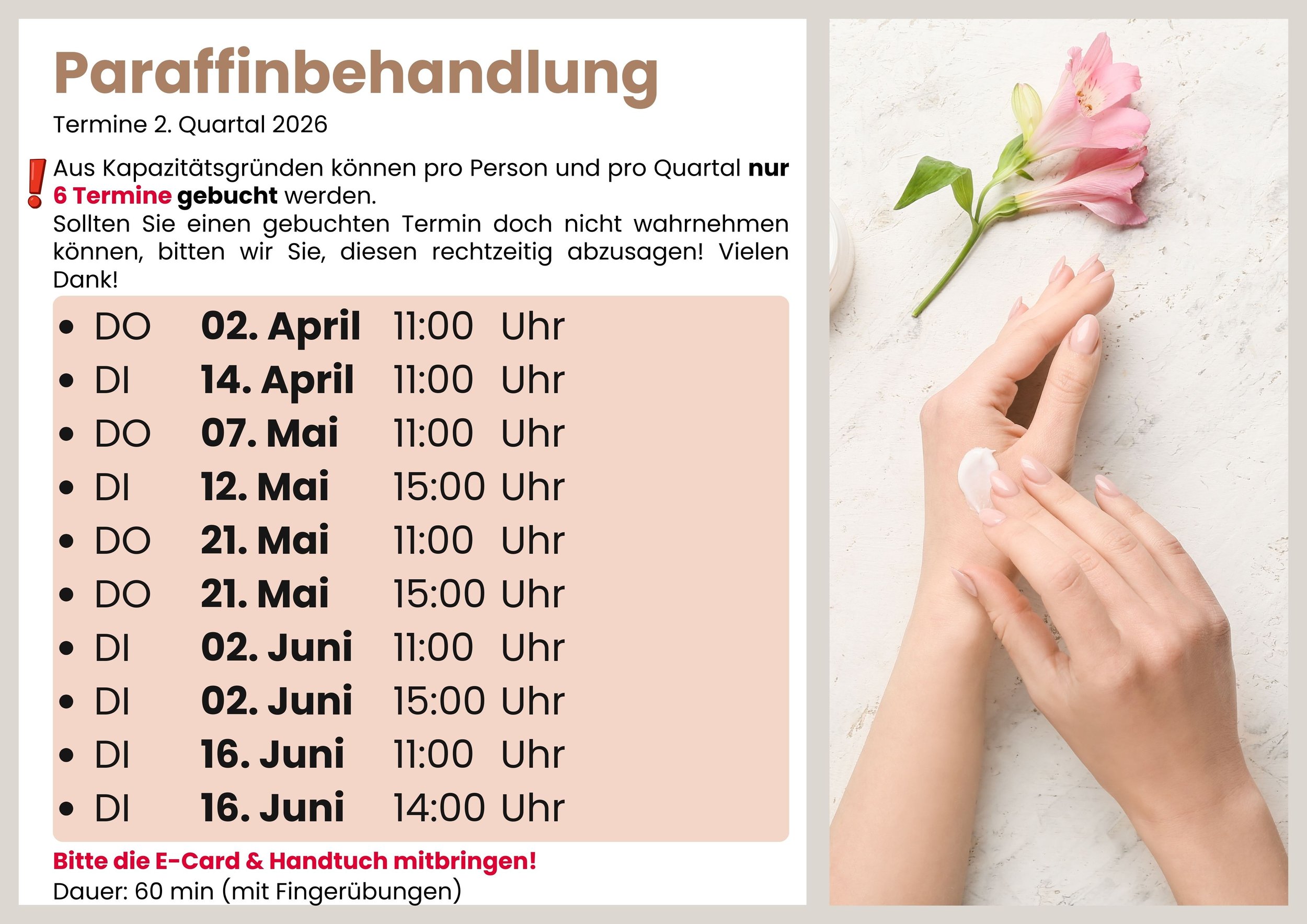 Die Anwendung (mit Fingerübungen im Anschluss) dauert gesamt ca. 60 Minuten und ist eine Leistung der österreichischen Sozialversicherung - somit für Sie kostenfrei. Bitte beachten Sie, dass die Anmeldung aus Kapazitätsgründen auf max. 6 Termine pro Quartal begrenzt ist.